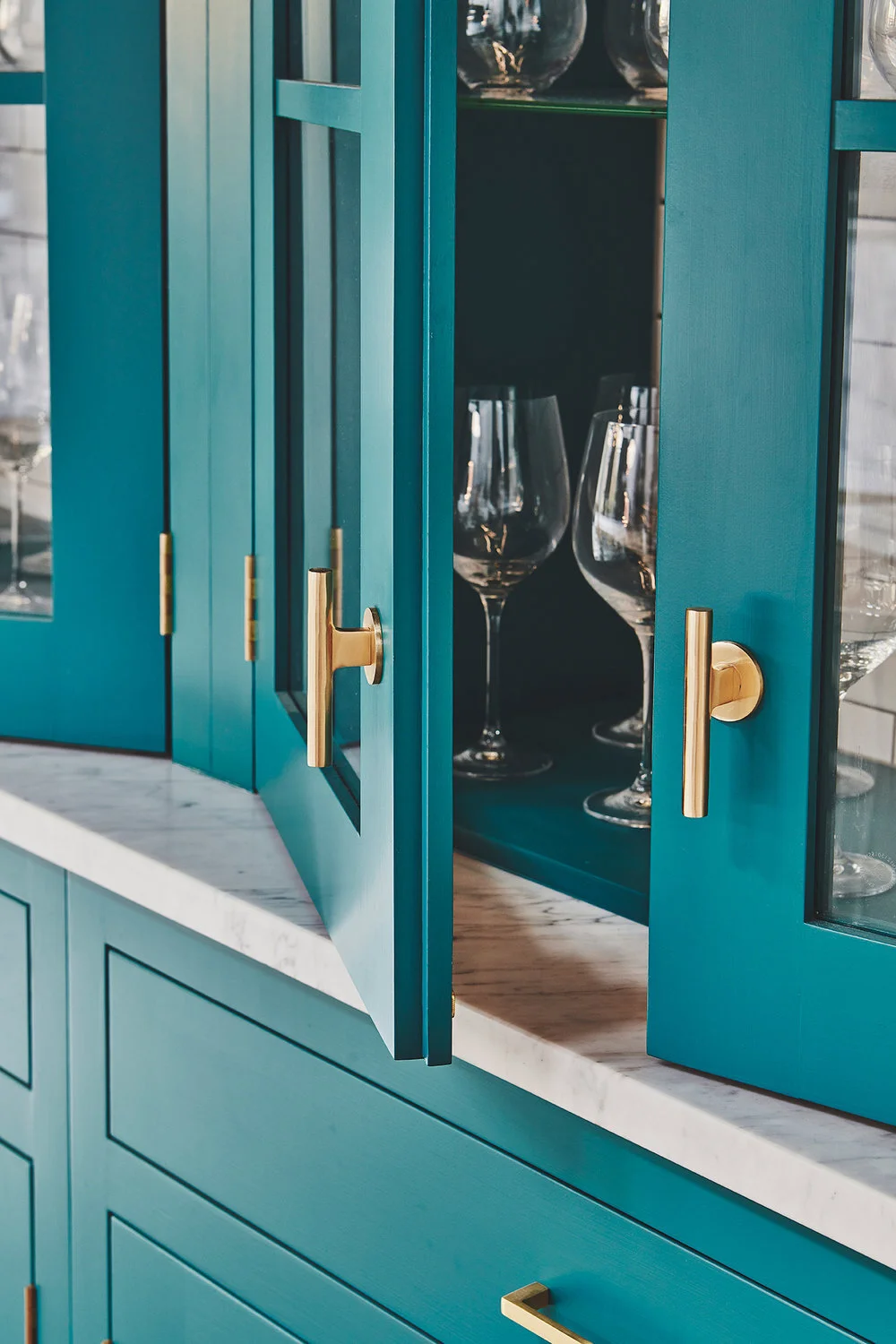 Increasingly when working closely with interior designers, we are manufacturing kitchens & joinery using a greener palette, and therefore interior design publications are increasingly drawing our clients attention to dark earthy green colours as an alternative to the deep blues. For the foreseeable future we will see clients embrace and start to request greens with increasing confidence; however, dismiss blue at your peril! Darker shades of blue will remain elegant and timeless. The renaissance of blue will be in its use as an accent colour, in more unusual tones and textures. Below I have outlined some examples of the evolution of blue.