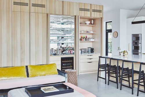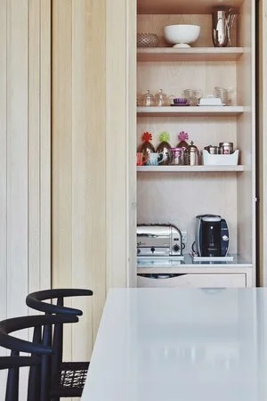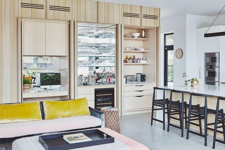 The desk area is used by the kids for supervised homework. Once the kids are in bed friends are invited around and the desk space and larder are shut away. The bar then opens up!