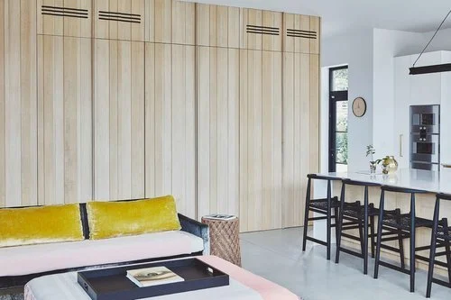 Expansive glazing meant concealed air conditioning units were a must. We placed them in the feature wall behind discrete routed details allowing optimal air flow into the room as well as keeping the bulky, unattractive units out of sight