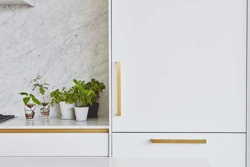We drew from our curated supplier network and sourced chunkier brass handles imported from the US. These were complemented by using a feature brass recess to the base cabinets. We clad the extractor in brass which was intentionally left raw to patinate over time.